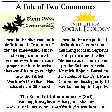 Extending equality in America from the political system to the economic system was the whole point of Bellamy’s Looking Backward, which was immensely influential around the end of the 19th century. Today, the time-based, labor-credit system innovations made by Kat Kinkade have successfully enabled the very thing that has eluded social reformers and revolutionaries since the early Industrial Revolution—a truly egalitarian economic system—which would seem to be exactly what Winstanley, Morelly, Owen, Warren, Proudhon, Marx & Engels, Bellamy, Skinner, Bookchin, and many others have sought!
